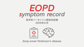 パーキンソン病の日常 若年性パーキンソン病症状記録2026年01月|EOPD個人ブログ日記 若年性パーキンソン病(EOPD)と診断され4年目になりました。3ヶ月に一度の定期検診に合わせて、症状記録やパーキンソン病にまつわる気になるニュースや研究結果について書いています。 2026.02.02 パーキンソン病の日常